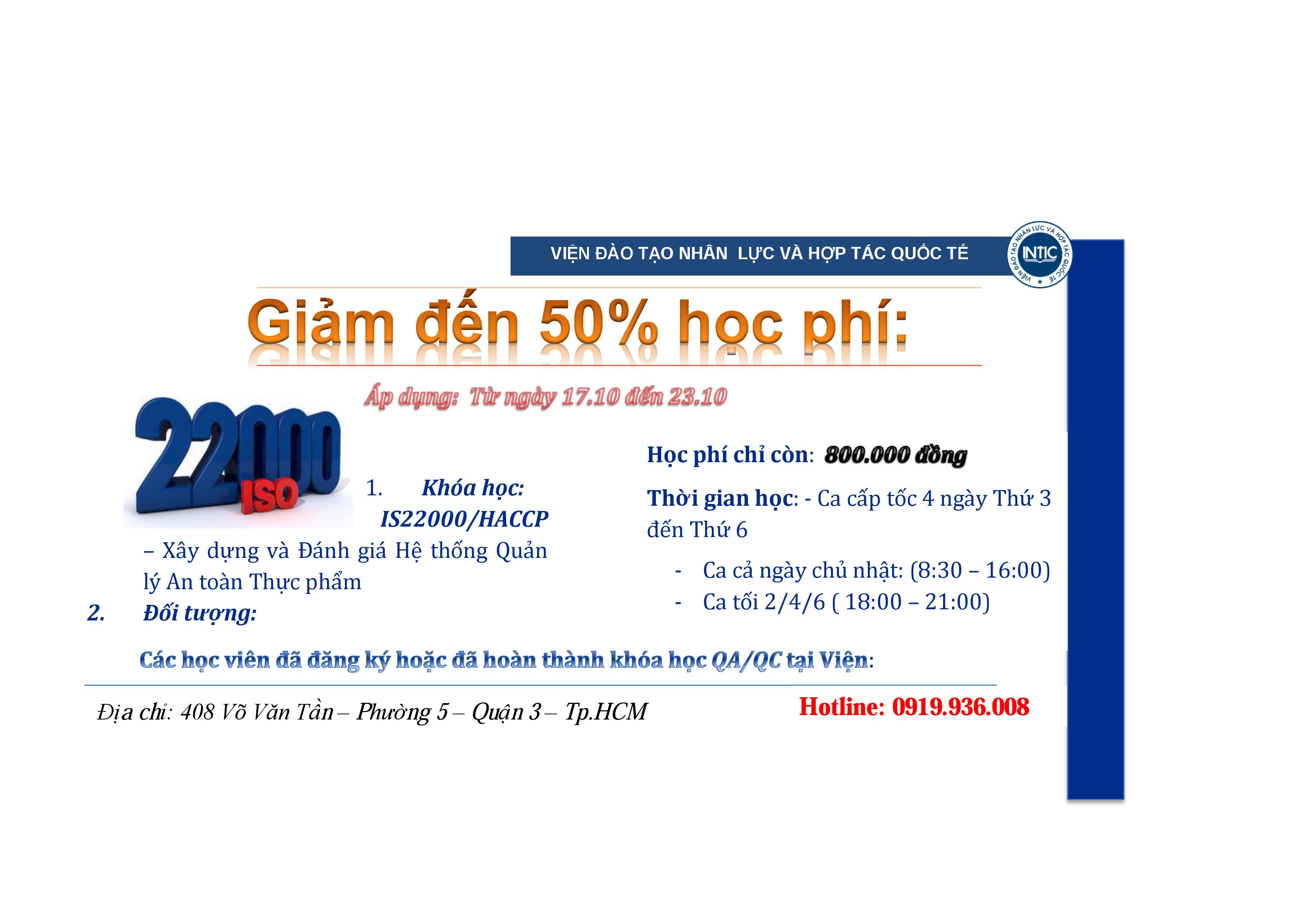 Tặng 50% học phí khóa học ISO 22000/HACCP (áp dụng: Học viên cũ tại Intic)