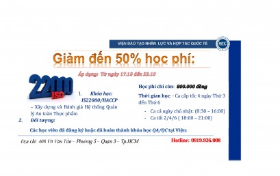Tặng 50% học phí khóa học ISO 22000/HACCP (áp dụng: Học viên cũ tại Intic) Kính gửi anh/chị và các bạn thân mến! Intic triển khai chương trình Tặng 50% học phí cho học viên cũ cụ thể như sau: ♣ Khóa học: ISO 22000/HACCP – Xây dựng và đánh giá hệ thống Quản lý An Toàn […]